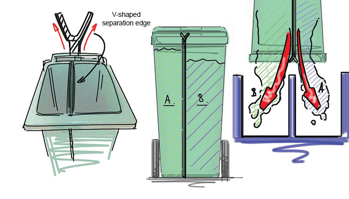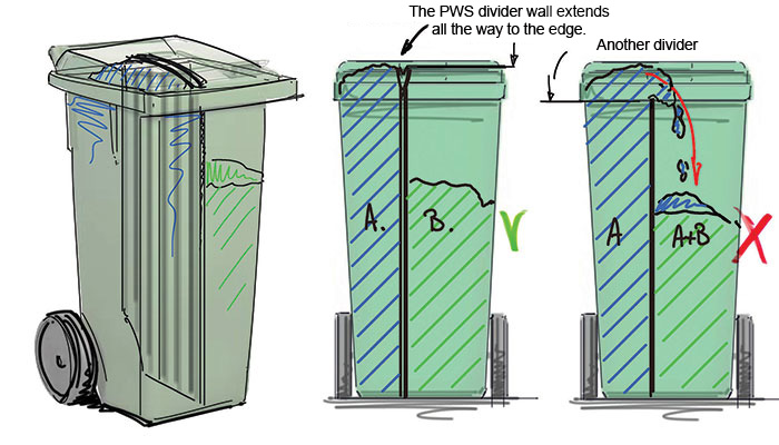 The divider is made of heavy plastic, in a construction that provides stability and is robust. The V-shaped separation edge at the top of the divider further contributes to the stability and control the waste, upon emptying. In this manner, the divider is not affected, even if the pressure increases from one of the two compartments in the container. It is very important that the divider wall is sufficiently stable so that the fractions are kept clean and do not risk mixing during the emptying of the container. The divider extends to the top of the container to ensure that the fractions are not mixed during emptying. The edges are designed with soft radius without sharp wrinkles, to prevent the waste from get stuck to when emptied.