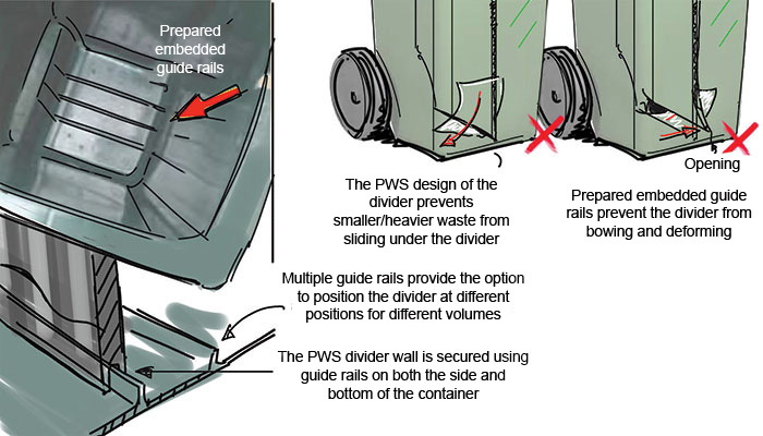 The PWS Duo Select waste management system is based on 190 L, 240 L, 370 L, 400 L and 660 L containers. The system can be used for waste sorting for recycling. The system is flexible and can easily be allocated with dividers. The divider wall can be placed in three positions, depending on the fractions and the need for volume; 40/60 – 50/50 or 60/40. If required, other divisions can be offered, upon request.
