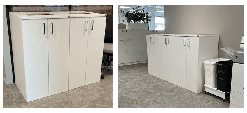 PWS public furniture was chosen for indoor sorting for Finnish Red Cross Blood Service to new head office in Vehkala, Vantaa. The furniture is part of the PWS standard range of Royal furniture and fit particularly well with Blood Service’s own furniture design. Inside the cabinets are 140 l bins for various recyclable materials.