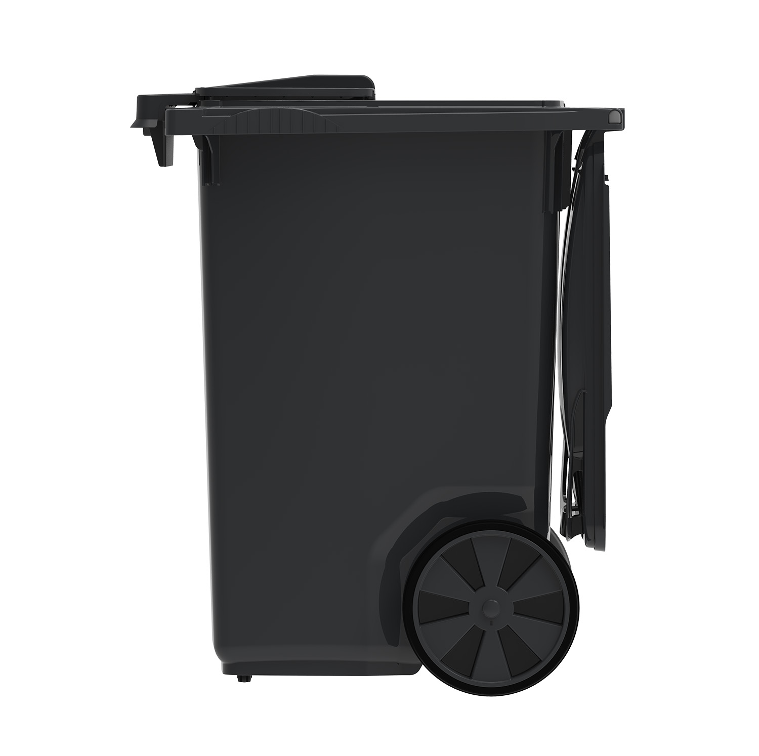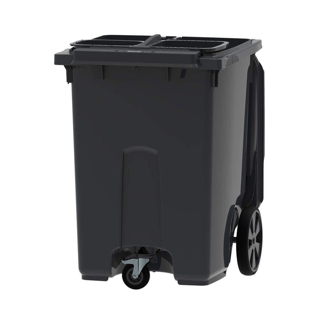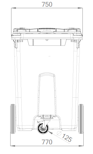- Hjul: 2 gummihjul Ø 310 mm som standard. Korrosionsfri stålaxel. Ett tredje integrerat hjul innanför kärlets yttermått, med broms och svängbart Ø 125 mm.
