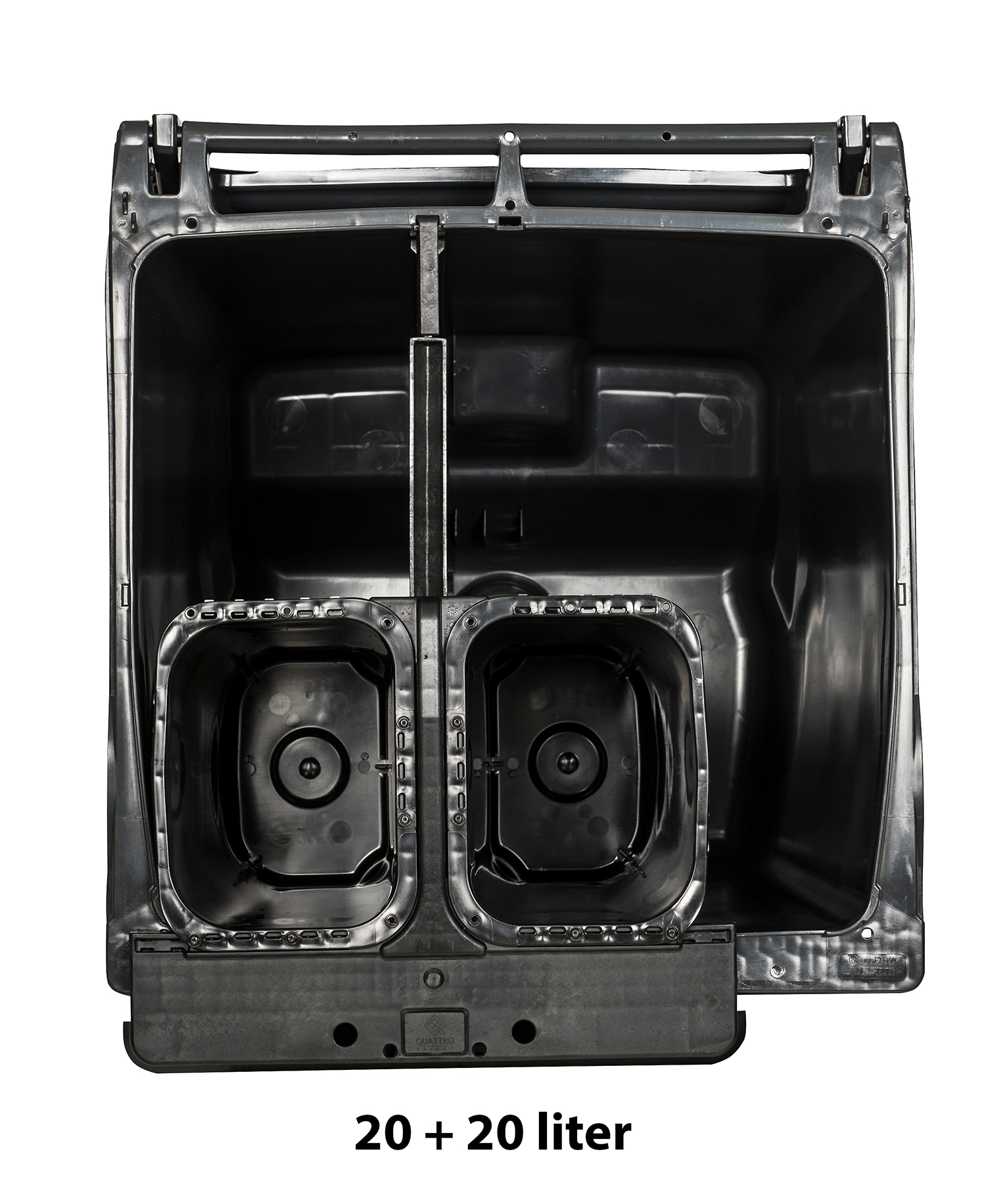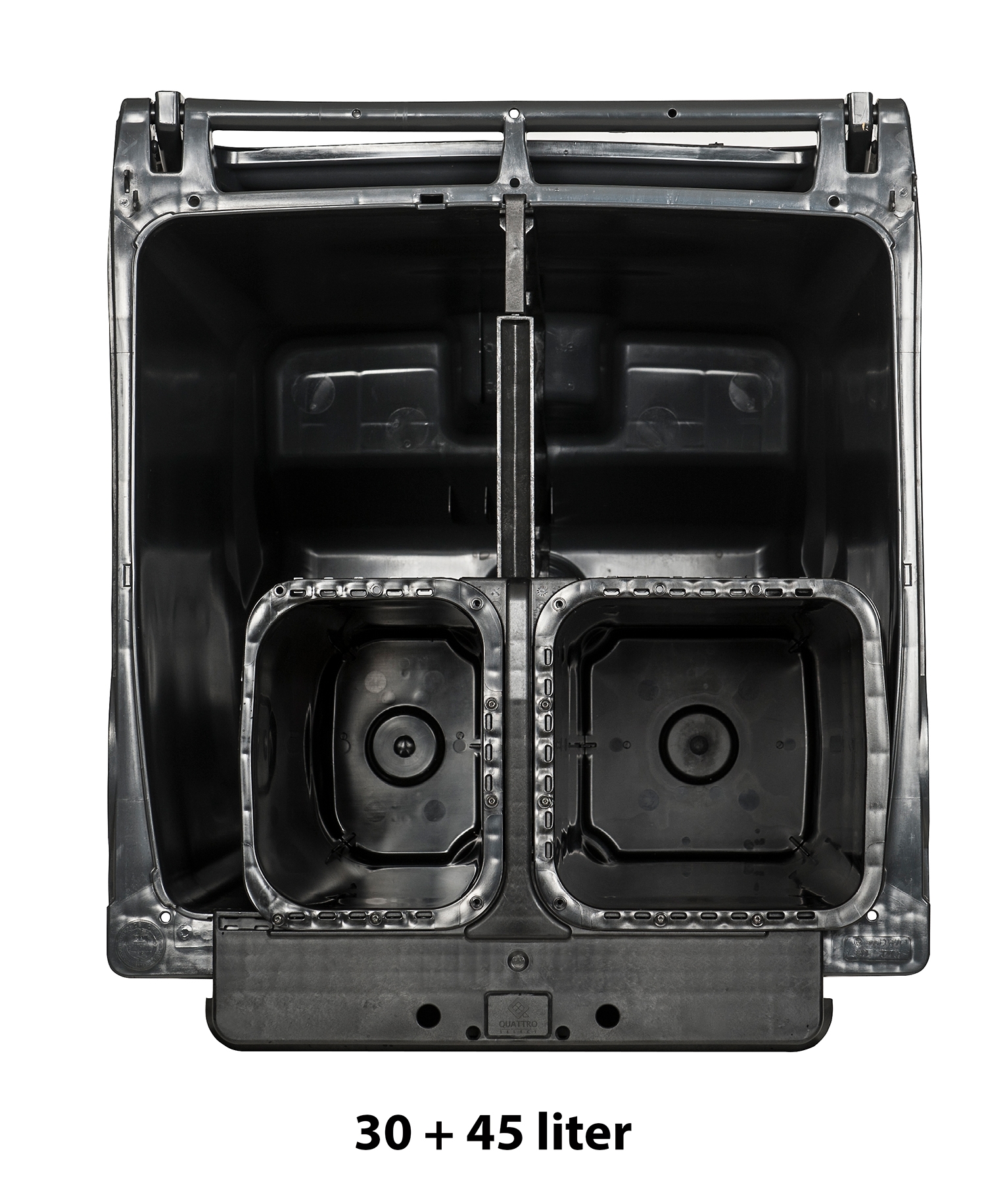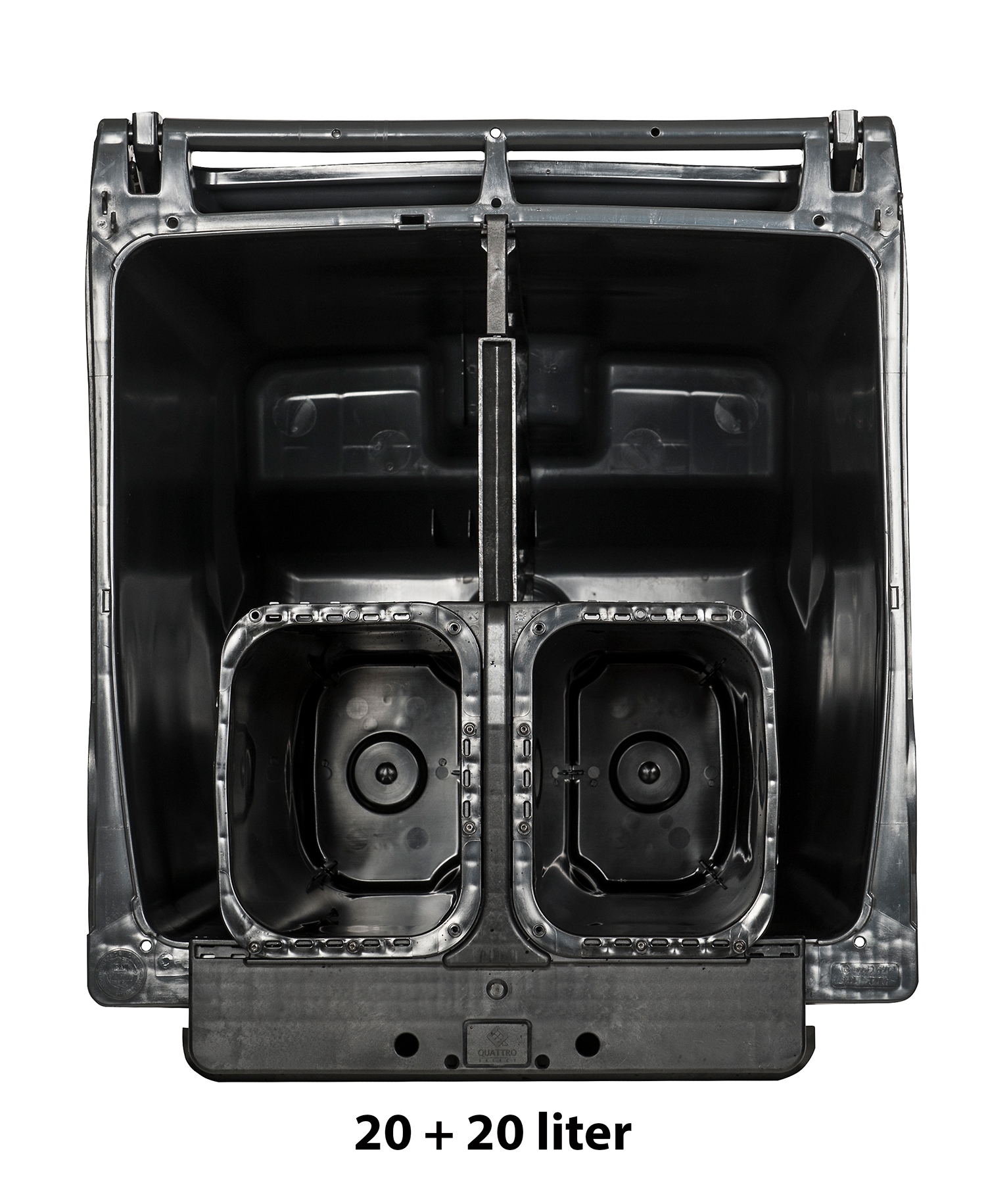 Quattro Select-systemet är ett flexibelt och genomtänkt avfallshanteringssystem med många valmöjligheter. Systemet består av två kärl, där varje kärl har en justerbar avdelare och två insatser. Avdelaren kan placeras i två olika lägen, vilket möjliggör volymfördelning på antingen 50/50 eller 40/60. Insatserna finns i fyra storlekar – 20, 30, 45 och 60 liter – vilket ger stor flexibilitet för olika typer av avfall.