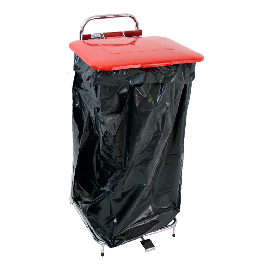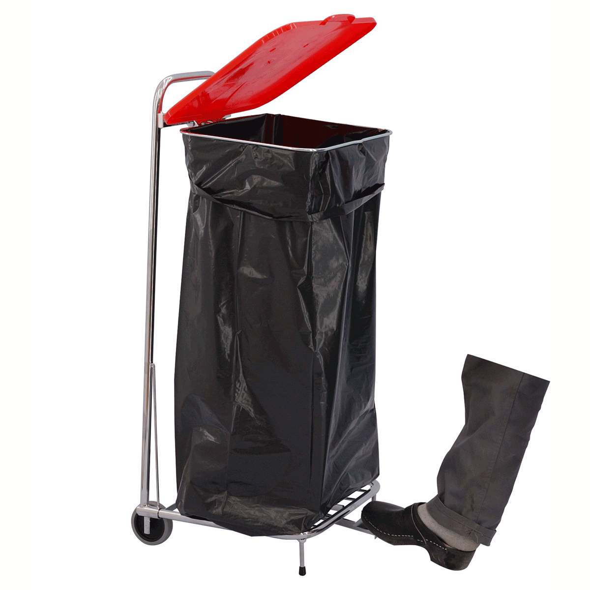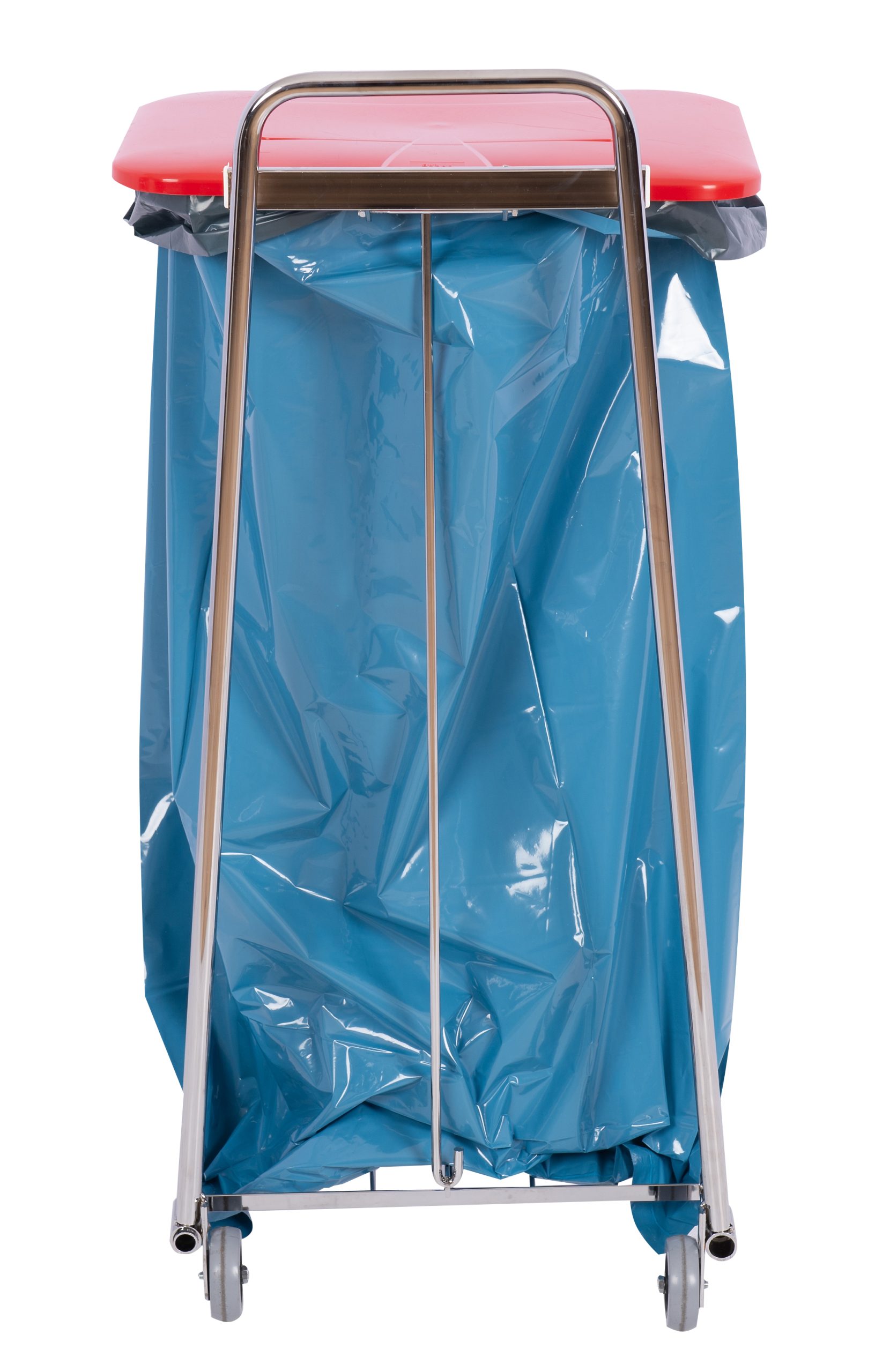 Golvstående säckhållare i metall Passar säckar på 125 liter och levereras med plastlock och fotpedal. Finns med två eller fyra hjul (vid fyra hjul är två låsbara). Utrustad med klämring eller annan lösning för att säkert hålla säcken på plats.