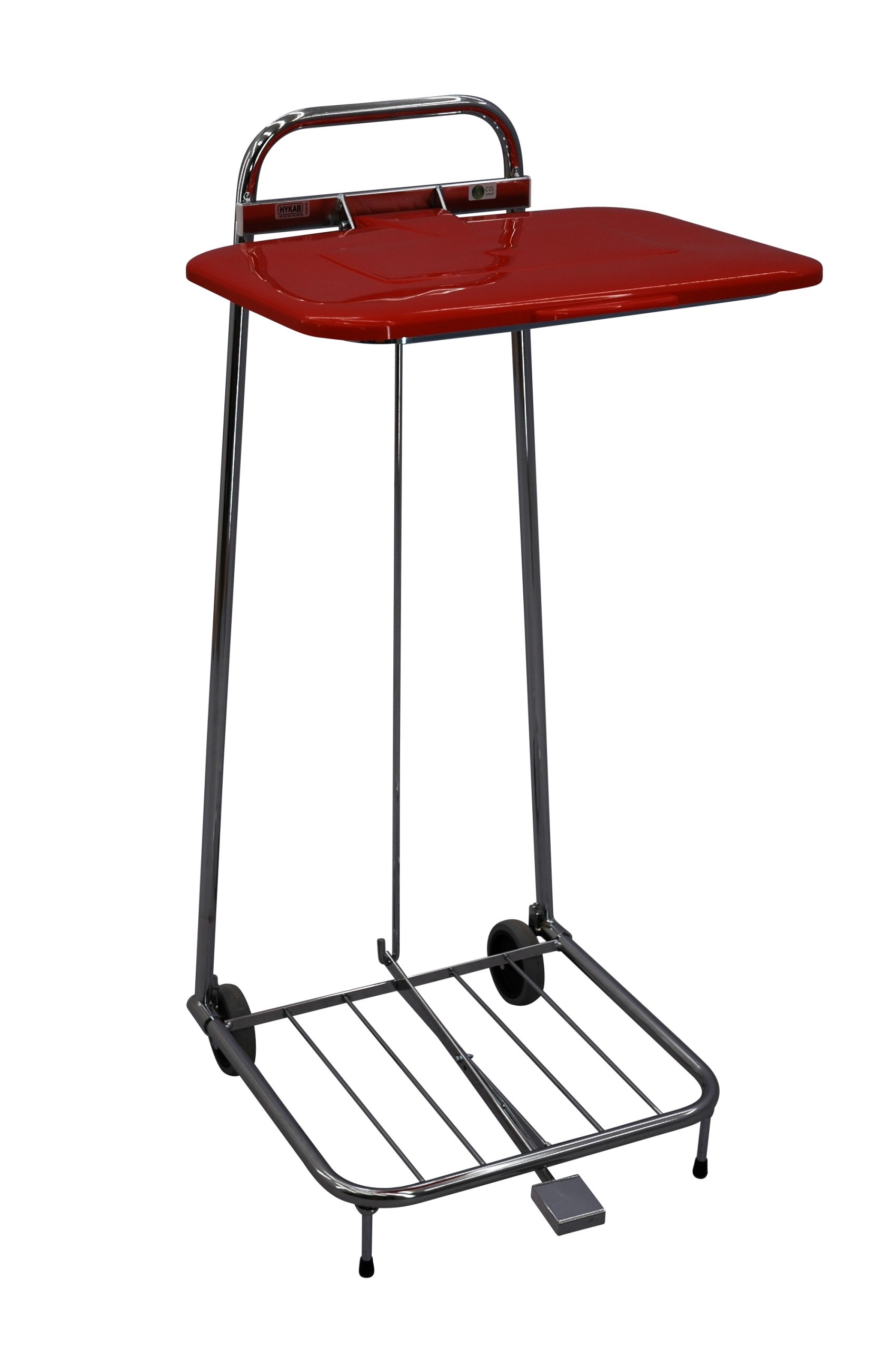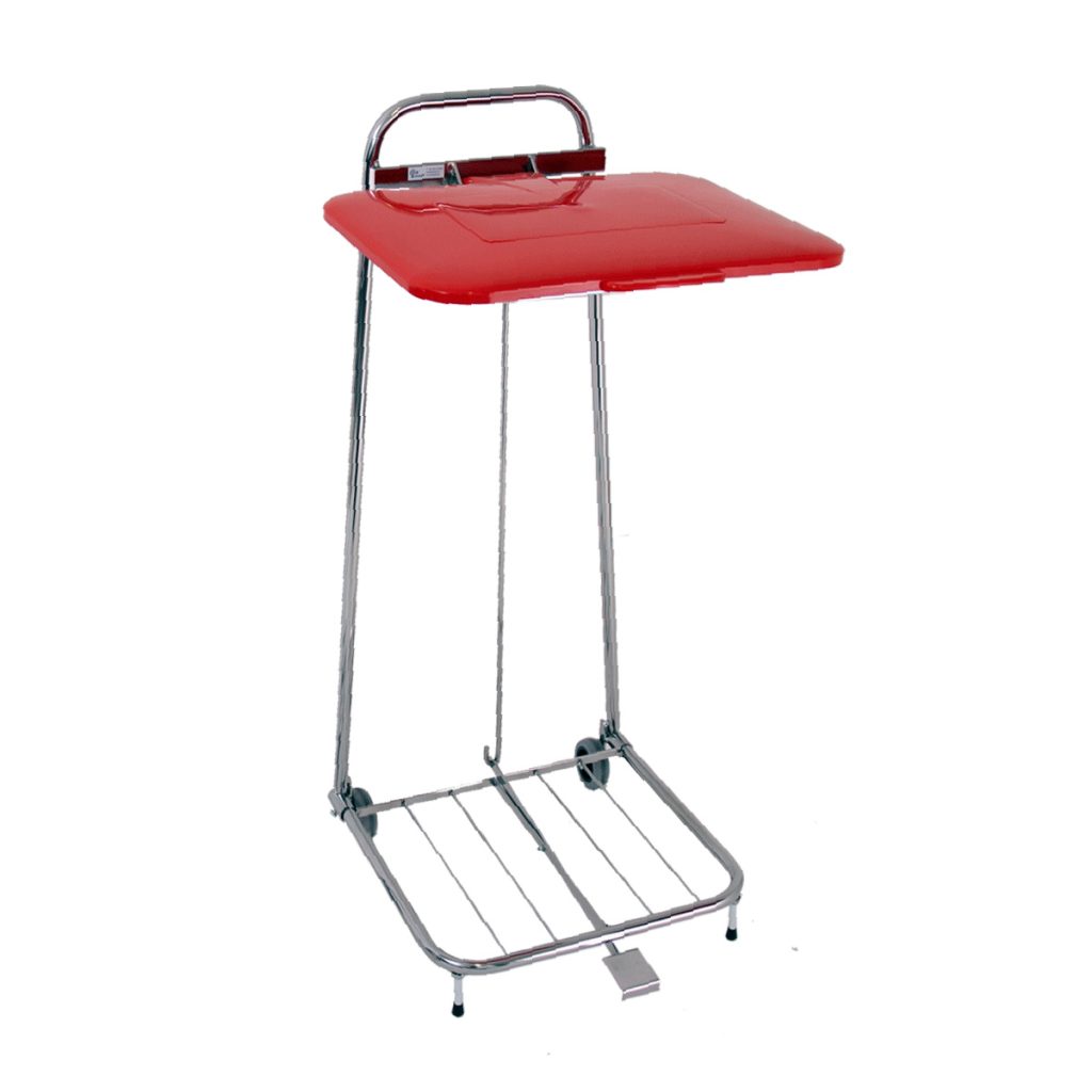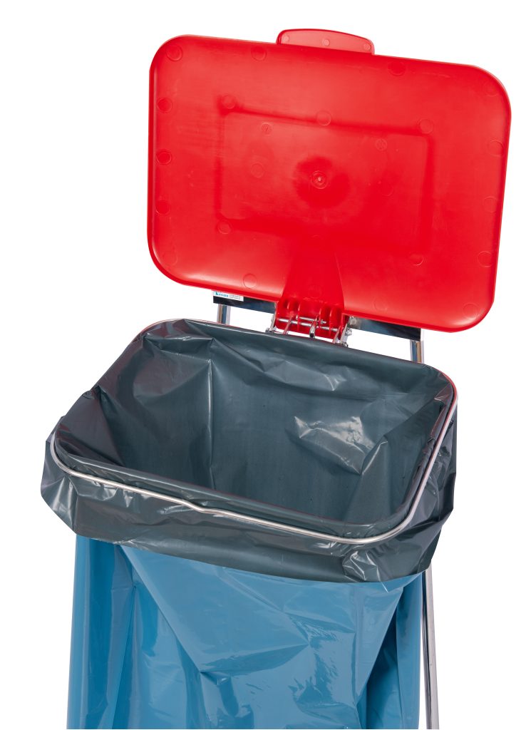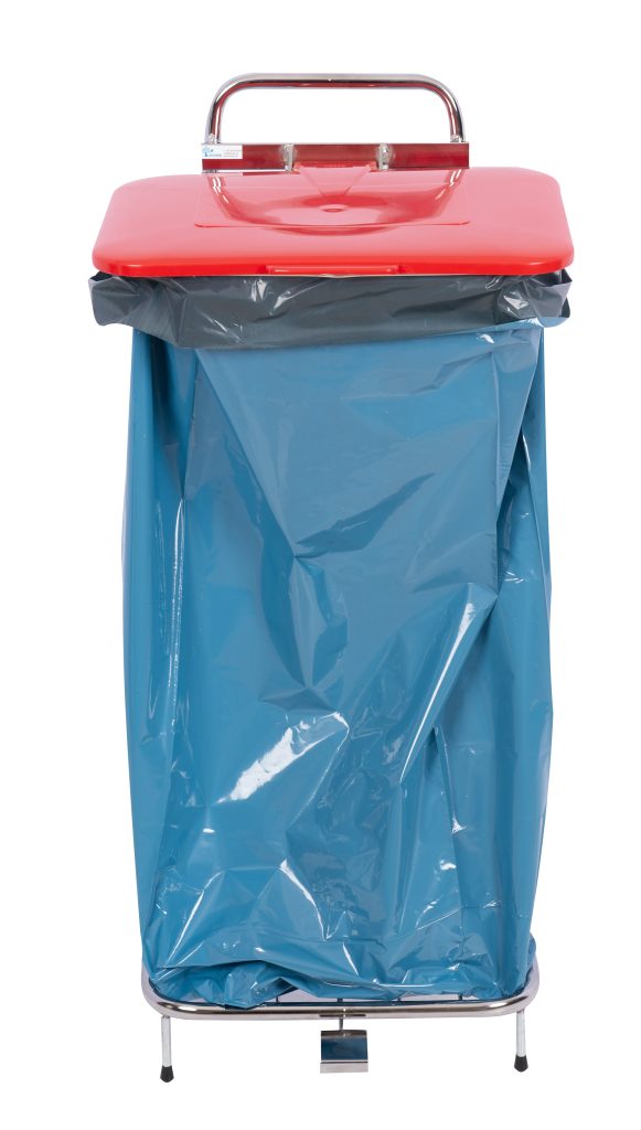 Golvstående säckhållare i metall Passar säckar på 125 liter och levereras med plastlock och fotpedal. Finns med två eller fyra hjul (vid fyra hjul är två låsbara). Utrustad med klämring eller annan lösning för att säkert hålla säcken på plats.
