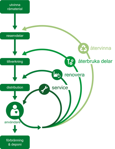 Loopen (se bild) närmast användaren ökar mervärdet för den cirkulära ekonomin och har en direkt inverkan på en produkts ekologiska fotavtryck och växthusgasutsläpp.